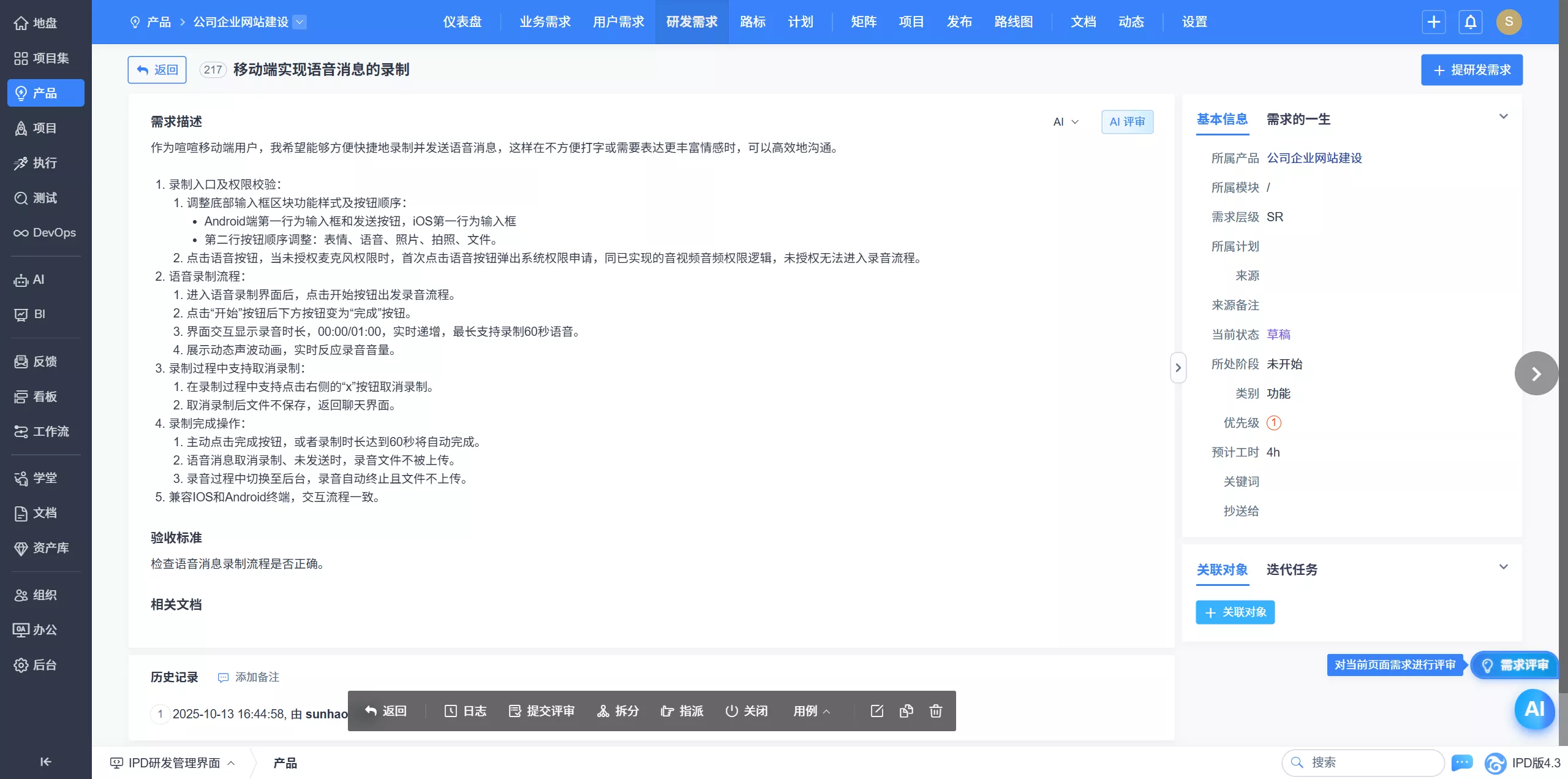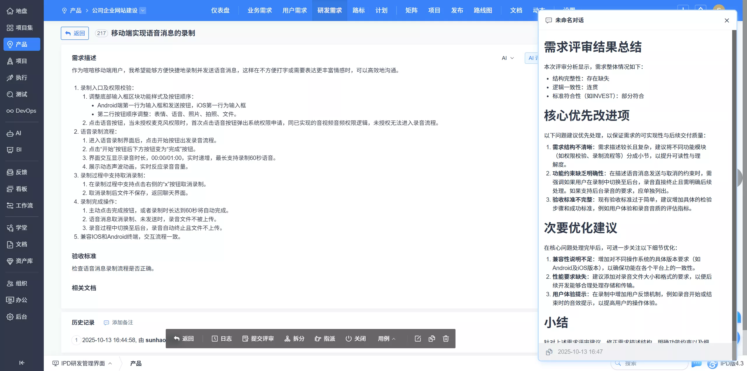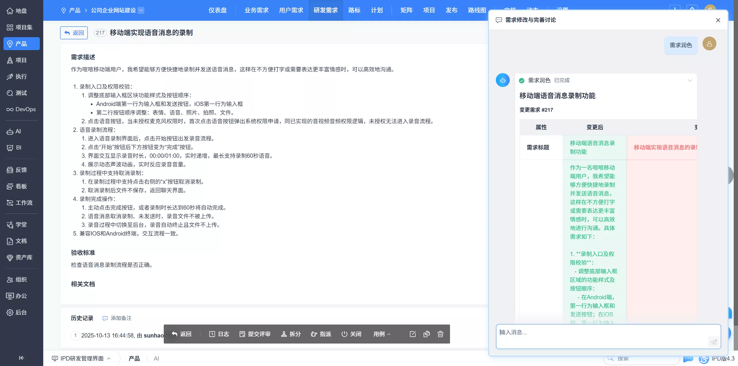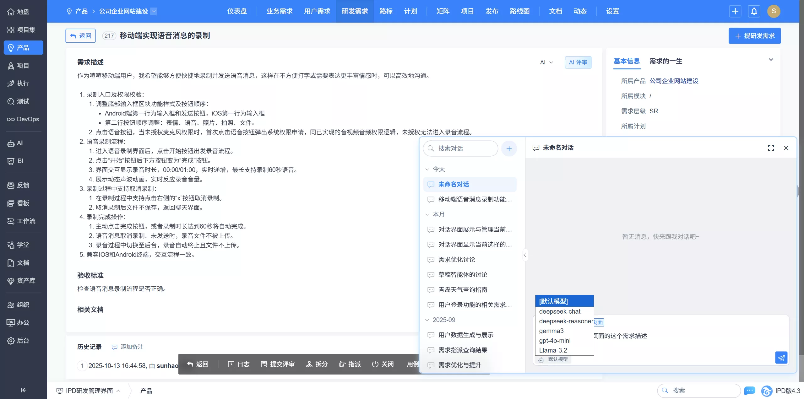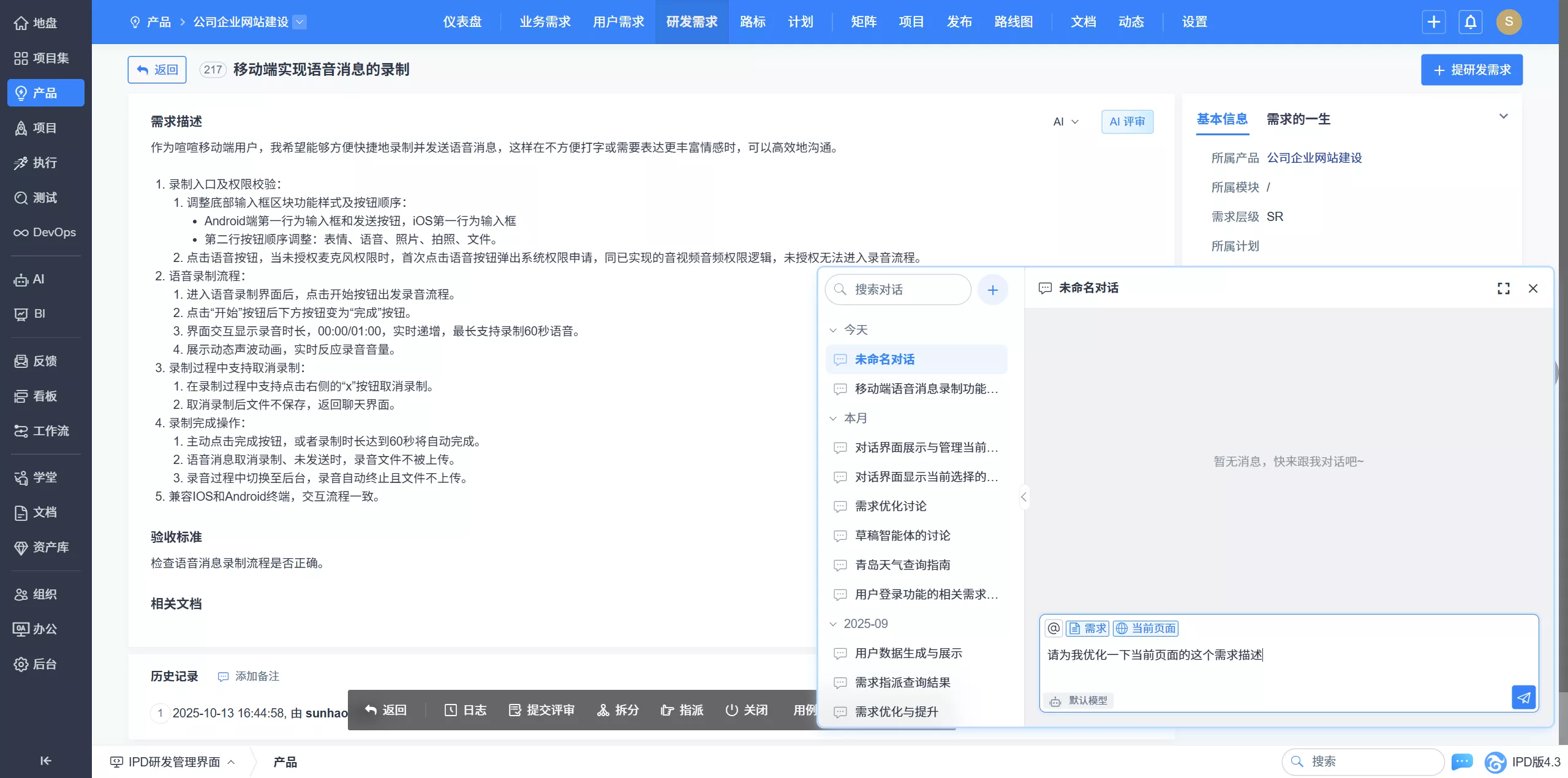 在禅道其他页面,您可以通过右下角AI悬浮小球,对当前页面内容进行快捷交流,或直接开启智能会话。