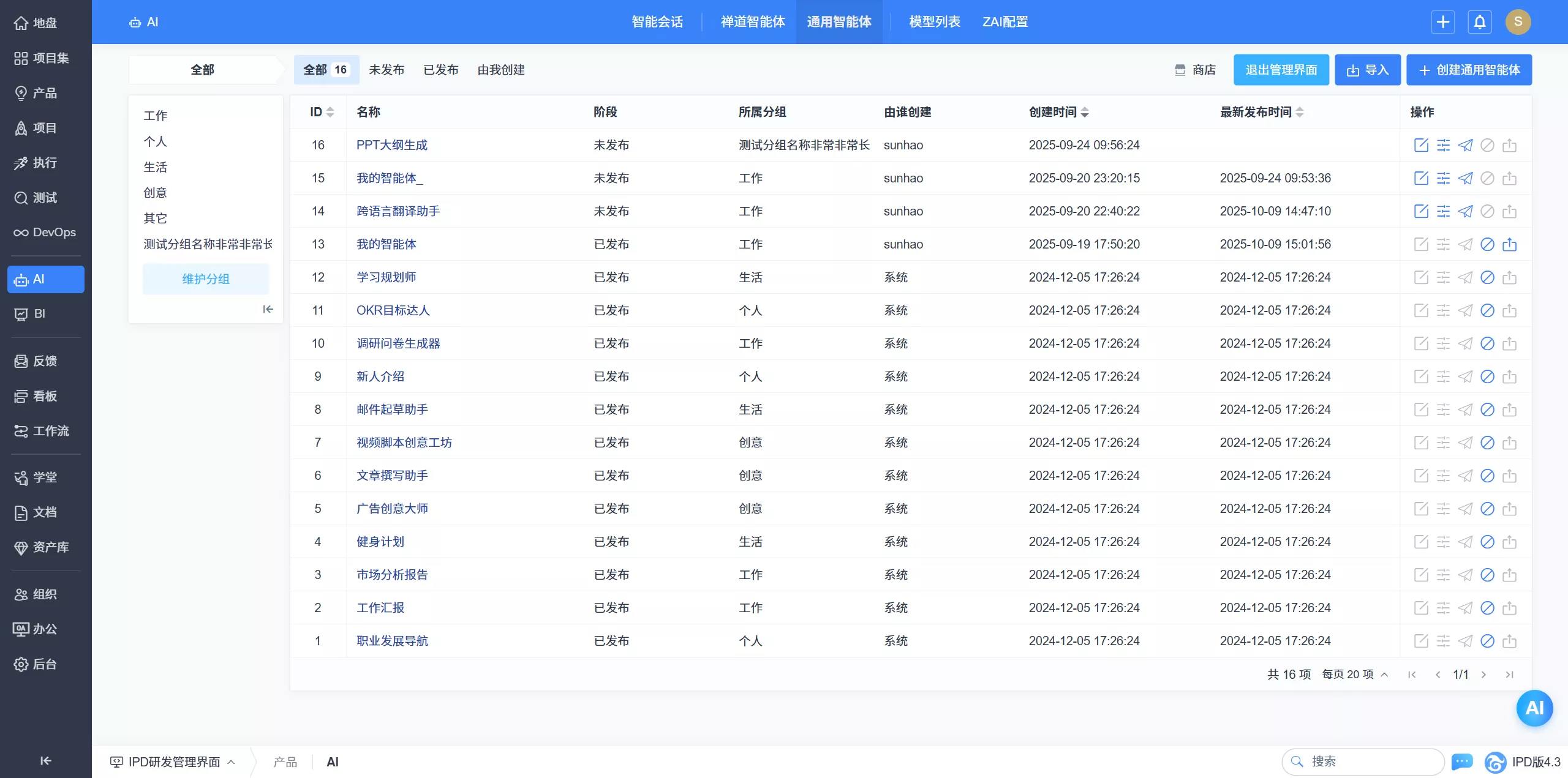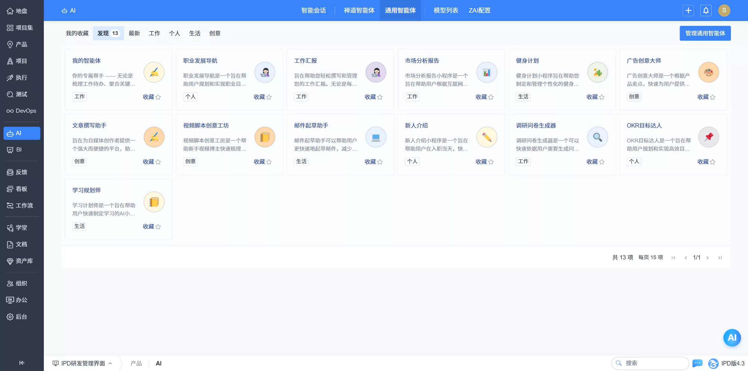 开源版内置12个通用智能体,企业版及以上版本可以自定义通用智能体。