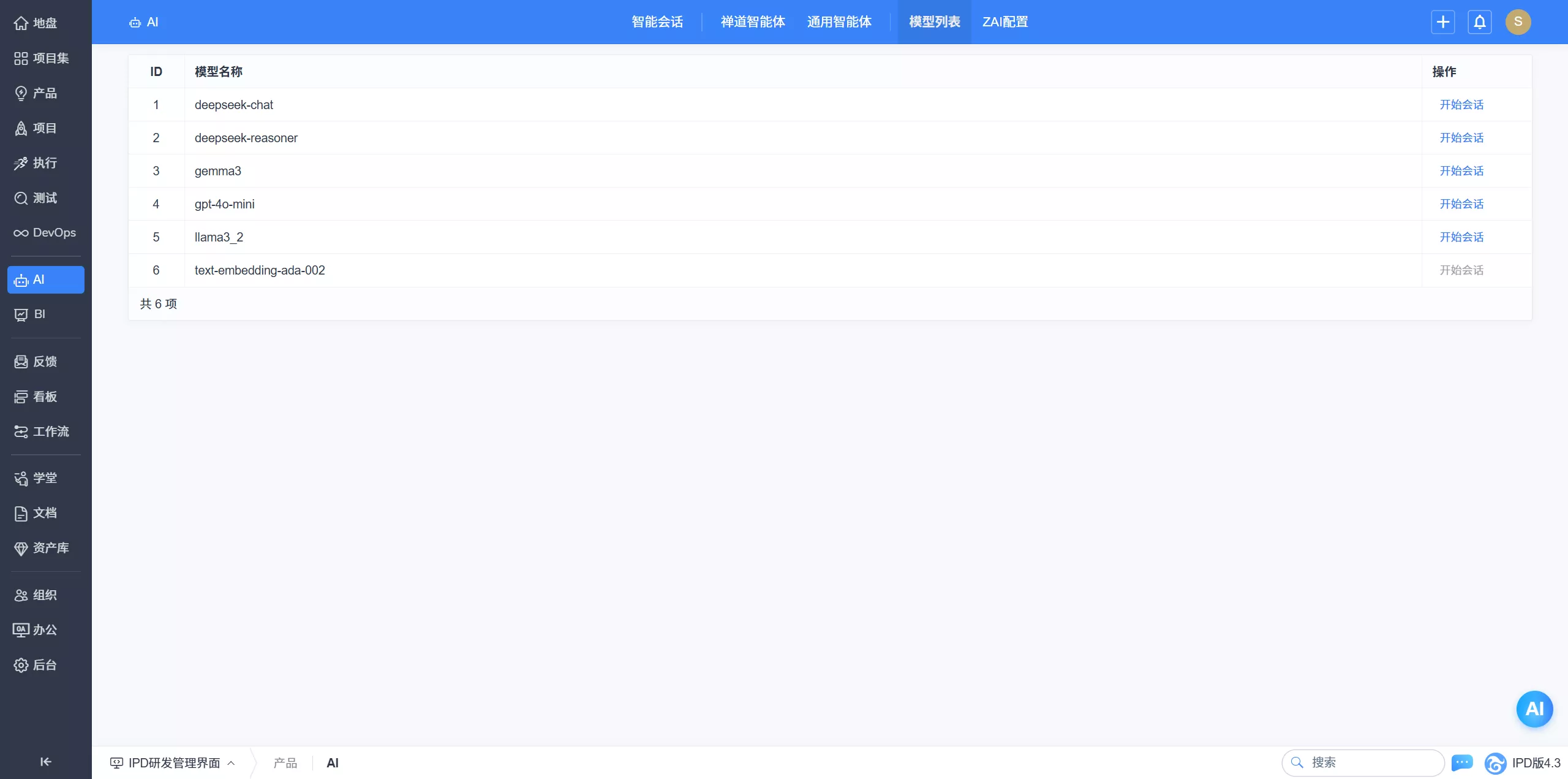 在这里可以查看ZAI服务中所有已对接的模型,并快速开启会话。