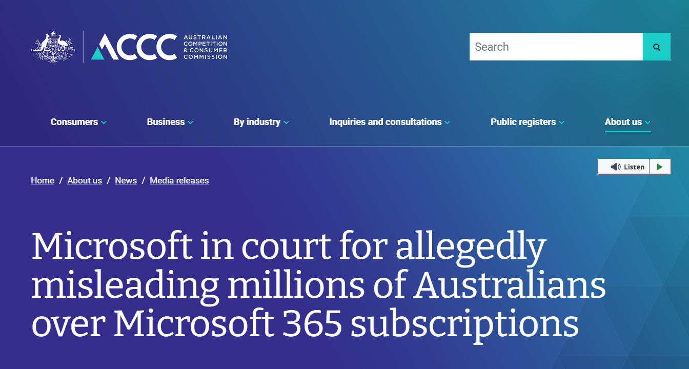 澳大利亚竞争与消费者委员会(ACCC)近日对微软提起法律诉讼,指控其在 Microsoft365产品订阅方面误导用户。