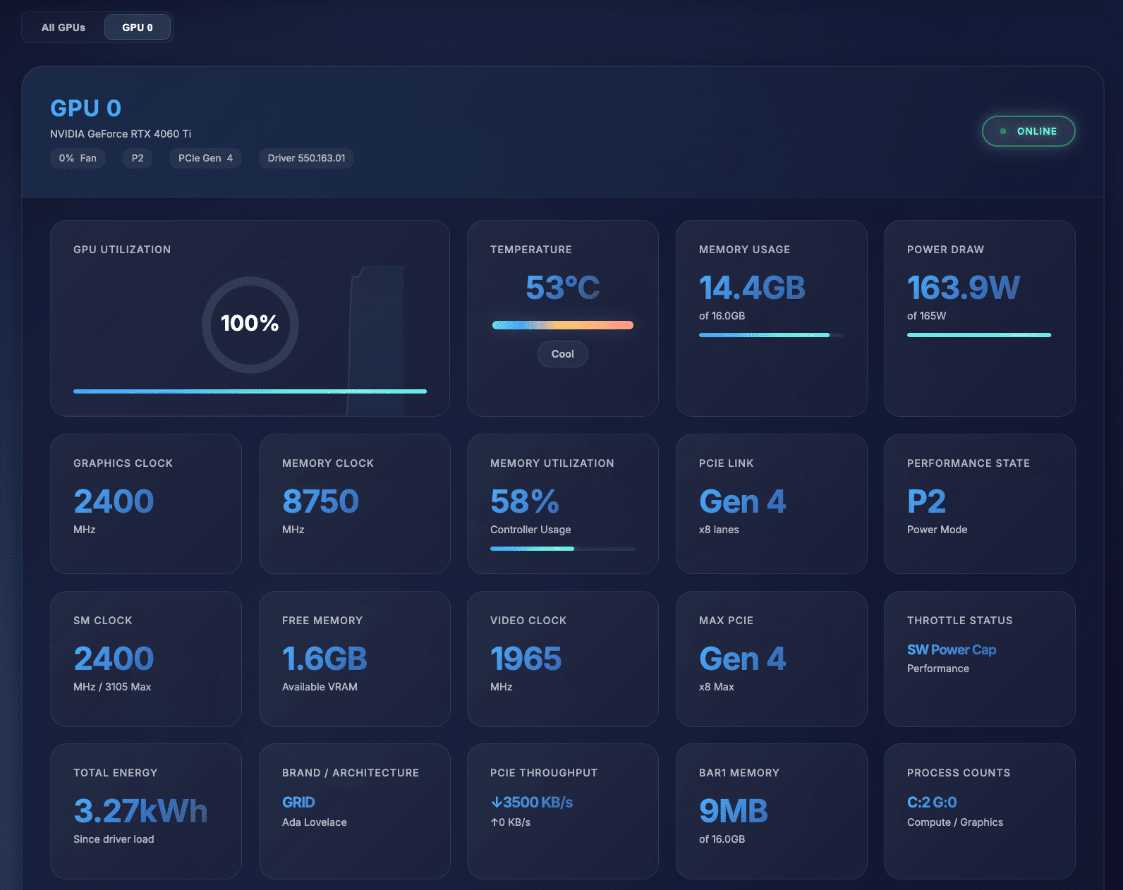 23、gpu-hot:实时的 NVIDIA GPU 网页监控面板。这是一个基于 FastAPI 开发的实时 NVIDIA GPU 监控仪表盘,支持利用率、内存、温度、功耗、风扇转速等多项 GPU 指标。它通过 WebSocket 实时推送数据,支持多 GPU、单机和 GPU 集群环境,并可通过 Docker 一键部署。来自 @wanzij 的分享