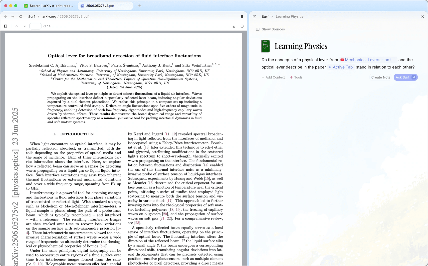34、surf:跨媒体的个人 AI 笔记应用。这是一款本地优先的 AI 笔记本工具,能够将多种媒体类型(如本地文件、网页、视频等)整合至本地资料库,并借助 AI 快速生成笔记。它帮助用户在学习和研究过程中,免去在浏览器、笔记应用、PDF 阅读器等多个应用和媒体之间切换、搜索和手动复制粘贴的繁琐操作,同时支持灵活选择 AI 模型。