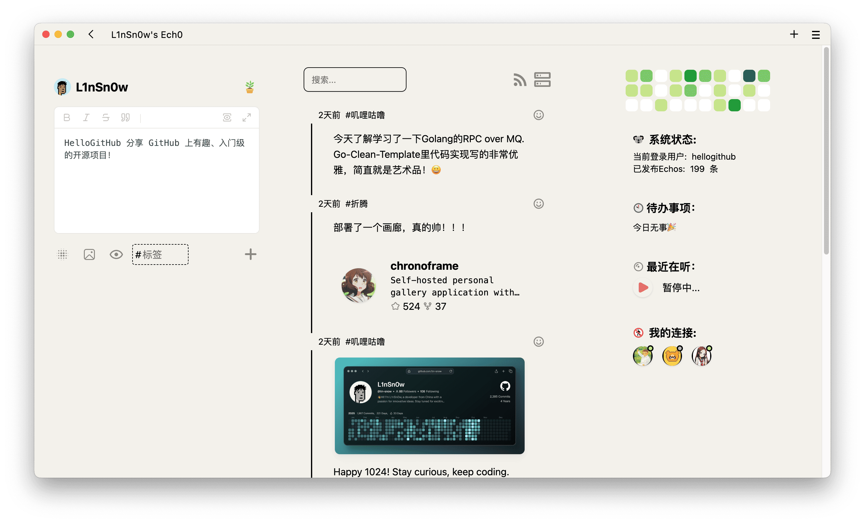9、Ech0:清爽的轻量级内容分享平台。这是一款开源、自托管的轻量级内容发布平台,专注于思想流动和快速分享。它拥有简洁直观的操作界面,支持发布和分享想法、文字、图片和链接。同时,支持类似 ActivityPub 的联邦协议,实现不同实例(站点)之间的互联互通,让内容不再局限于单一孤立的网站。来自 @L1nSn0w 的分享