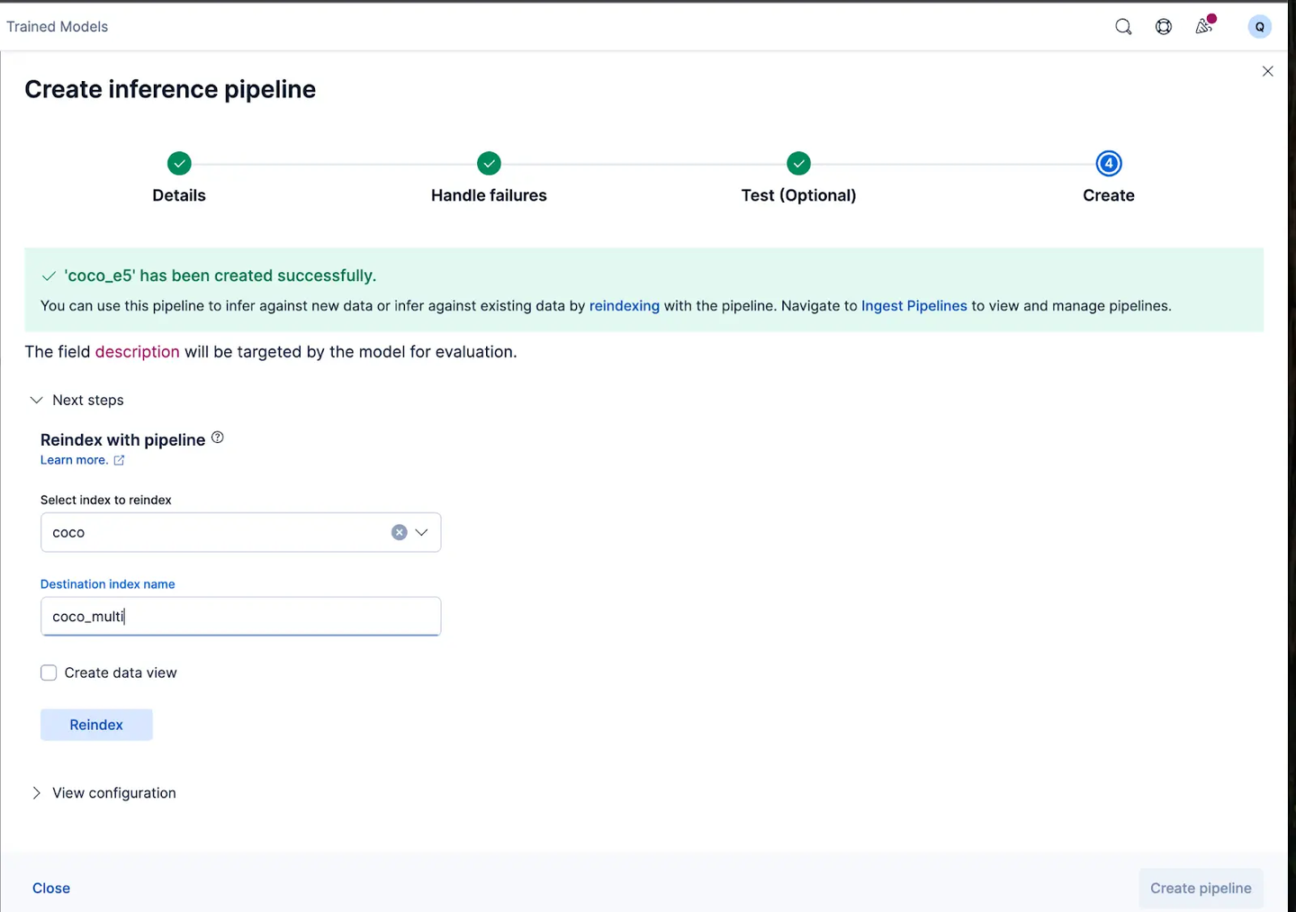 管道创建成功后,你可以立即使用该管道,通过向导将原始索引数据重新索引到新索引,从而生成嵌入。点击 Reindex 开始该过程。