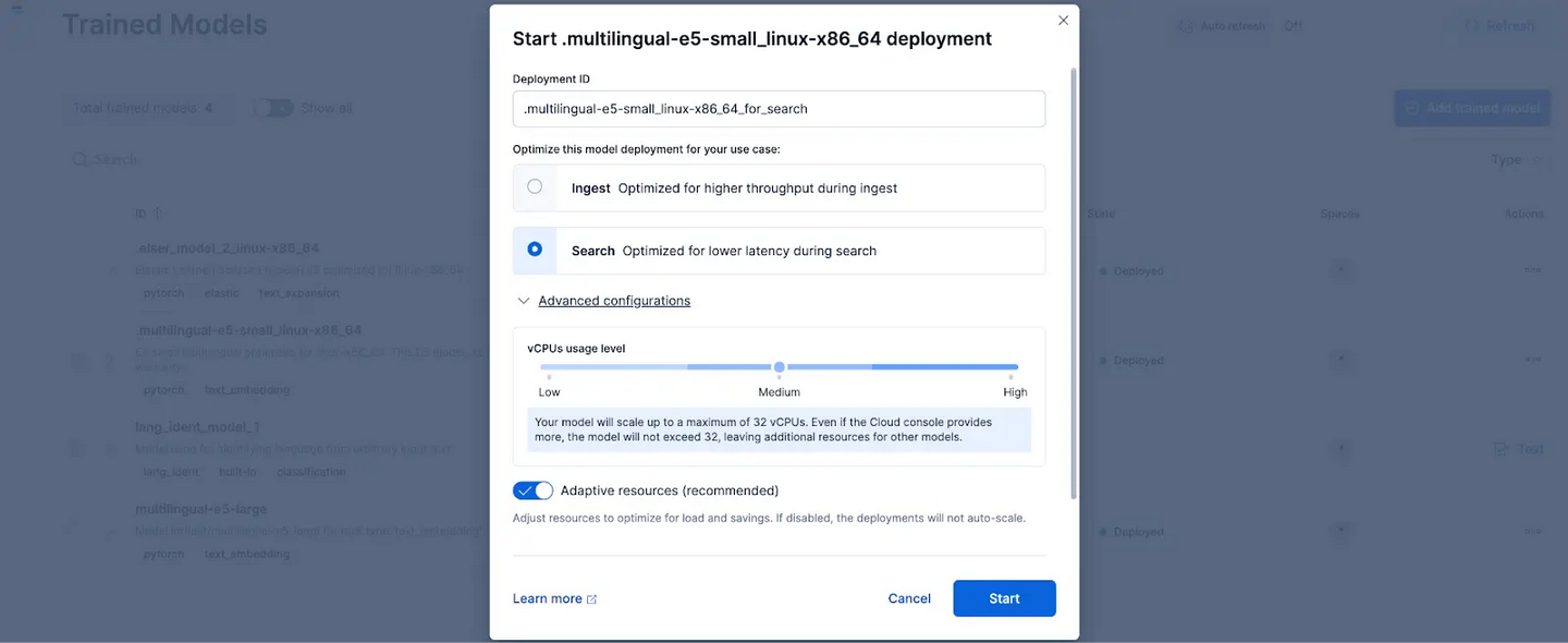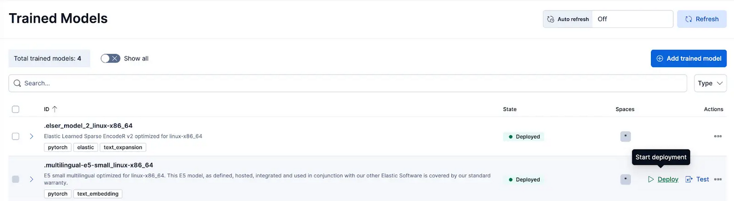 在 Kibana 中,导航到 Stack Management > Trained Models 页面,然后点击 .multilingual-e5-small_linux-x86_64 的 Deploy。