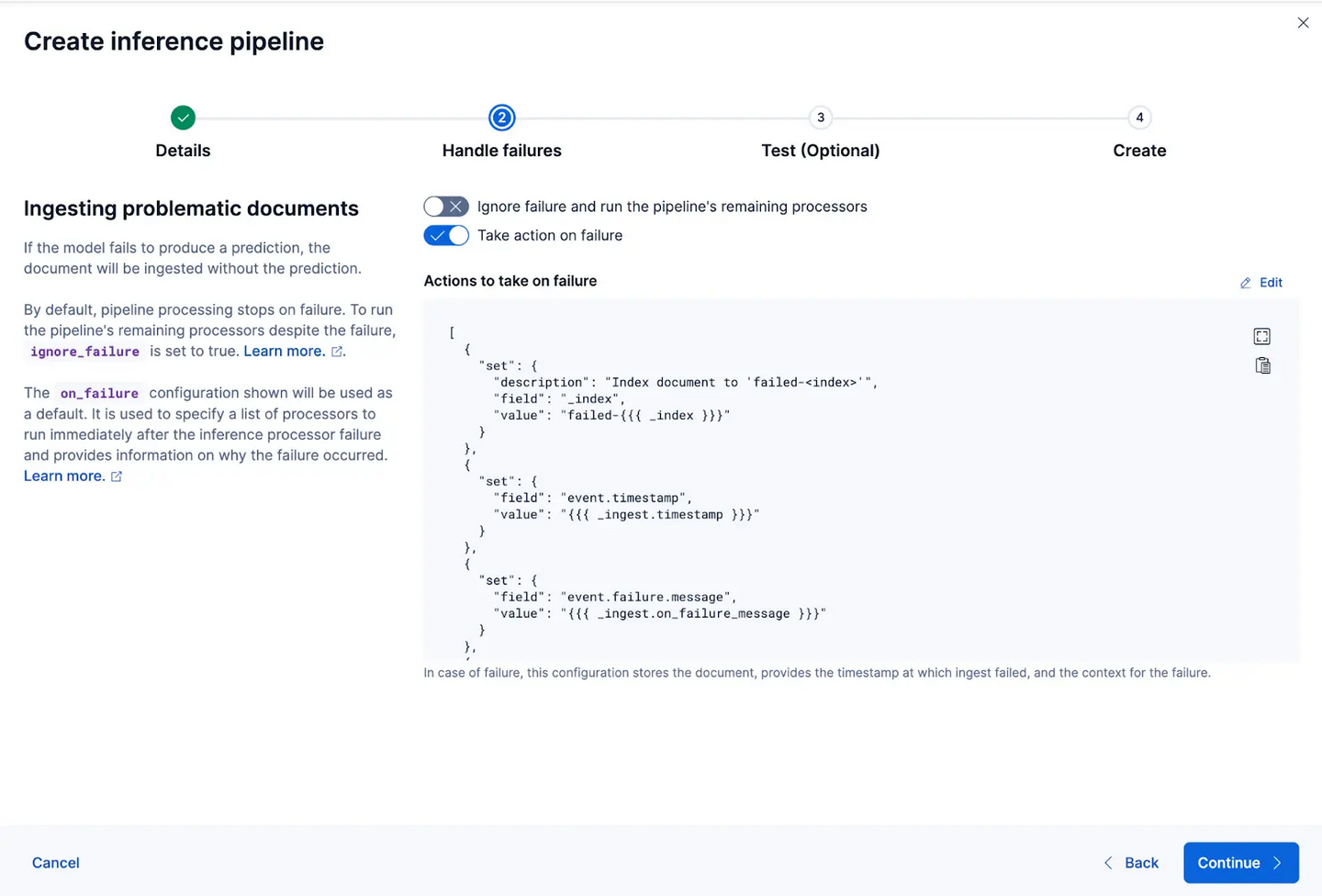 该向导还可以自动填充处理器,以在数据摄取和处理过程中处理失败情况。