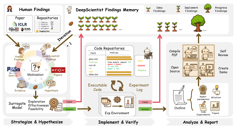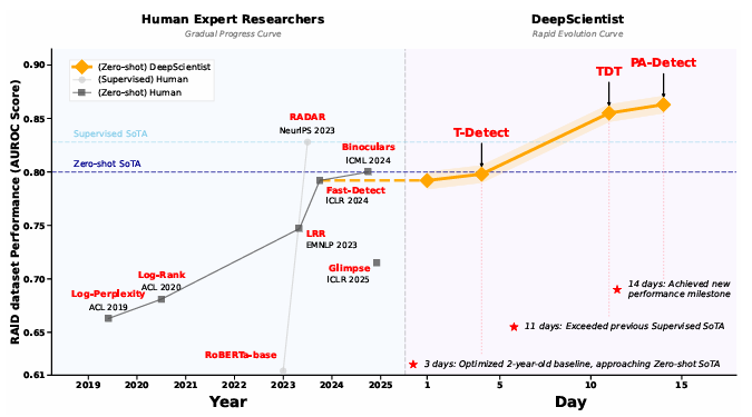 据介绍,DeepScientist是首个具有完整科研能力,且在无人工干预下,展现出目标导向、持续迭代、渐进式超越人类研究者最先进研究成果的AI科学家系统。