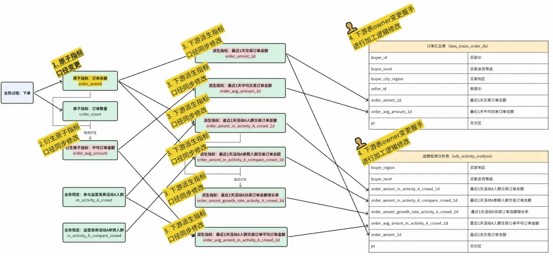 其中最为关键部分为“指标建模”。我们将指标的口径组成拆成了三部分组成:原子指标、业务限定、统计周期,同时在其物化到表上的时候再确定统计粒度。通过原子要素的组合定义指标可以确保同样的指标在公司全局只会有一个,以及标识出不同的汇总表、应用表中的指标是否为同一个。另外当原子口径发生了变化,系统也可以根据血缘关系找到受影响的指标和表,让owner进行握手确认,确保口径变更一致性。例如下图所示: