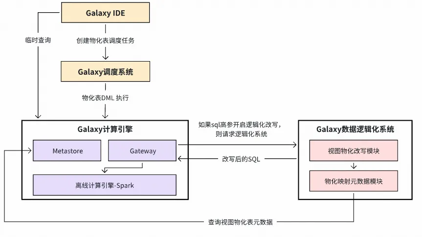 数据逻辑化的关键技术之一为视图物化表的命中。当某个视图存在物化表时,需要将对应查询范围的数据直接翻译成物化表的查询,而不去展开视图查询,以提升查询性能。技术链路如下图所示: