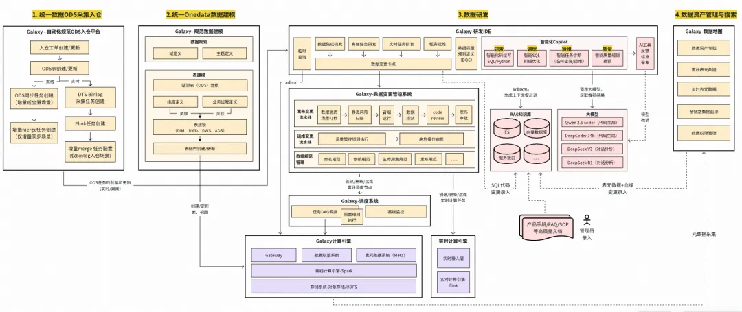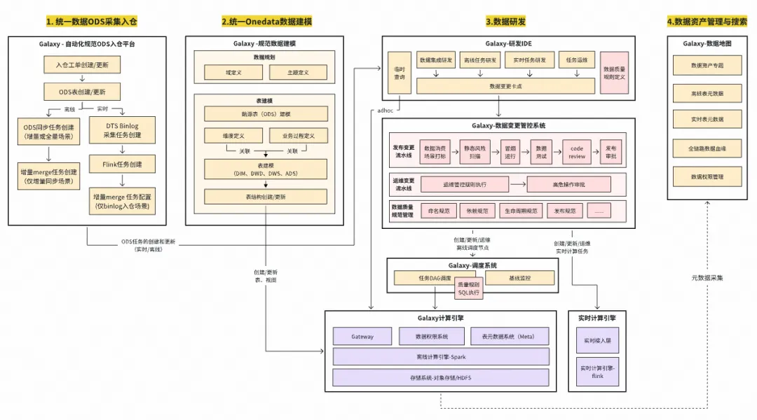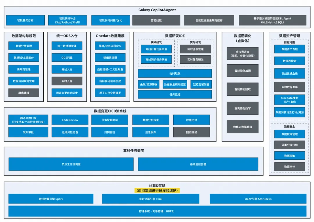 因此24年技术部正式启动大数据系统自建,Galaxy数据研发与管理平台为其中一个重要项目,负责面向参与数据生产的用户,提供离线和实时数据的采集同步、研发运维、加工生产、数据资产管理以及安全合规的能力,满足业务长期发展对于数据架构、数据质量、数据交付效率的诉求。