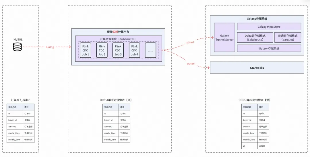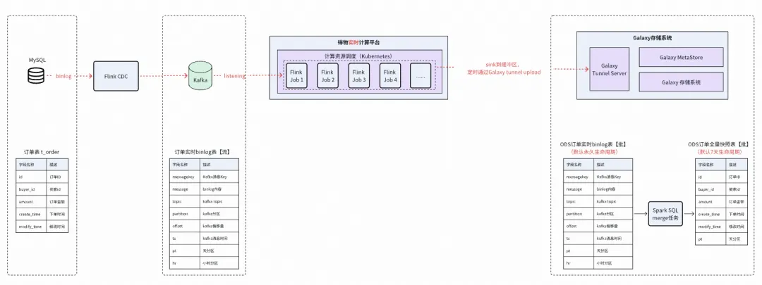 对比离线数据入仓,基于binlog的实时入仓可以避免对数据库造成压力,减少了对网络带宽的依赖,同时对于超大规模的表可以大幅缩短基线加工时长。但此方案依然需要(小时/天)将增量数据和全量数据做Merge处理和存储,这会产生冗余的计算和存储成本,且时效性也较差,因此本质上只能为离线数仓场景服务。