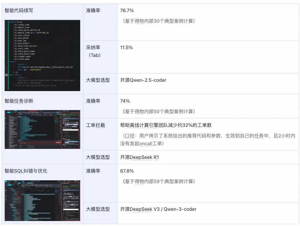 目前Galaxy研发平台已经落地了智能代码续写、智能任务诊断、智能SQL纠错与优化3个Copilot应用,具体业务效果如下: