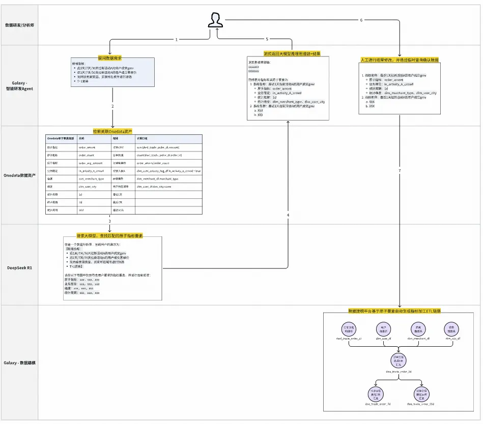 Galaxy的ETL Agent会采用“NL2Metric2SQL”的方案。通过大模型进行自然语言的解析,结合向量数据库的相似度匹配实现NL2Metric的能力,然后基于Onedata数据模型和指标语义层,将自然语言的用数需求准确翻译为指标原子要素(原子口径、业务限定、统计周期、统计维度),并自动构建ETL加工链路。如下图案例: