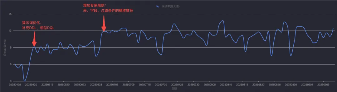 其中高活用户的智能代码续写功能开启率为98.5%,整体采纳率趋势和我们做的优化动作如下: