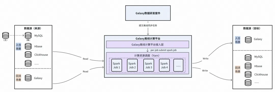 目前Galaxy数据研发套件的离线同步内核基于Spark Jar进行实现,下图为离线数据同步架构: