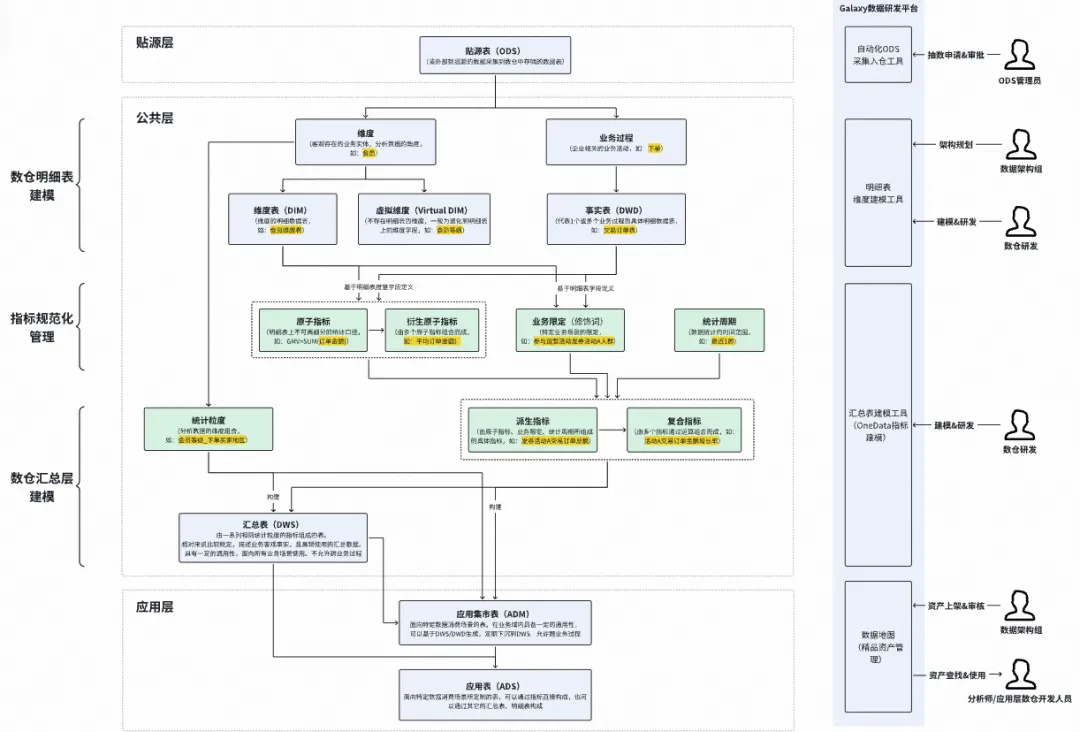 - 保证维度和指标一致性:通过维度和业务过程的概念建模,确保维度表和事实表的全局唯一性;同时通过原子要素的指标建模,确保指标口径的全局无二义性。