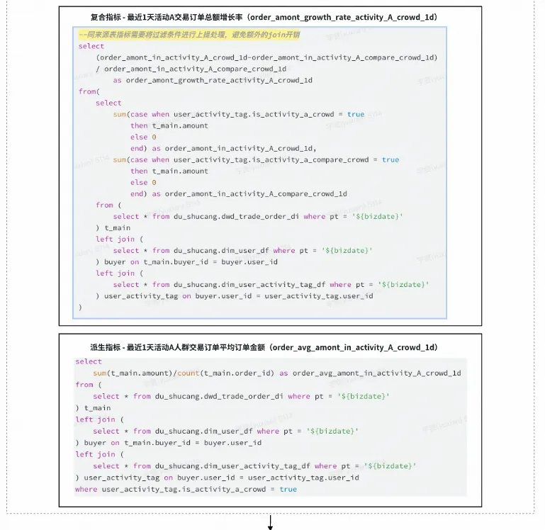 从上图我们也可以看到,原子口径的变更影响非常大,即使可以基于血缘进行变更握手管控,人工修改逻辑也容易改错或遗留。因此我们实现了自动化指标代码生成的能力,基于原子口径自动化生成指标及其物化表的加工逻辑。