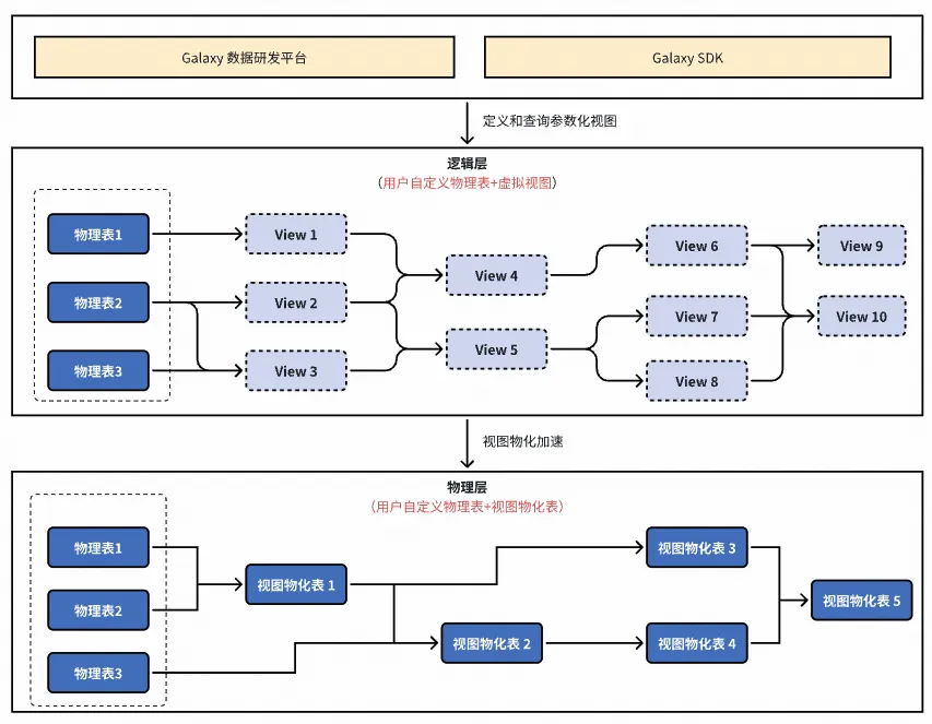 数据逻辑化架构,会存在两层,上层为由用户定义的物理表以及虚拟视图组成的逻辑层,对用户感知;下层为物理表和系统自动生成的视图物化表组成的物理层,对用户不感知,具体如下图所示: