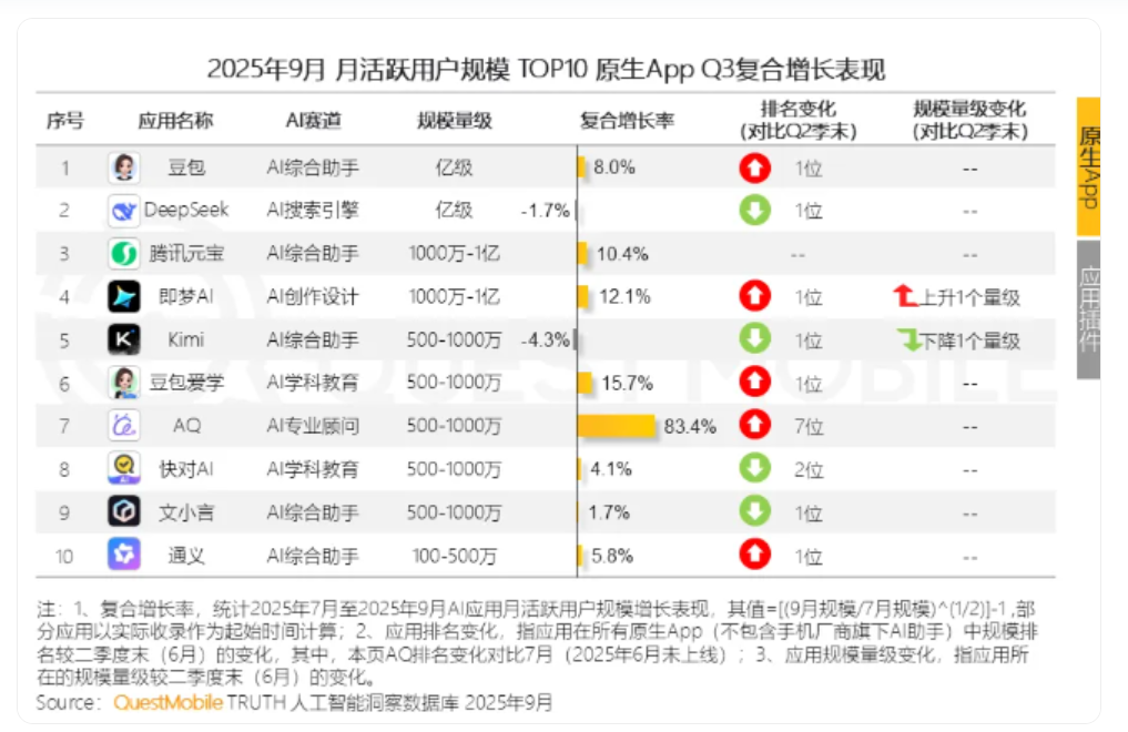 AI 应用市场 Q3 现状:移动端用户突破 7 亿,豆包夺原生 AI APP 月活第一