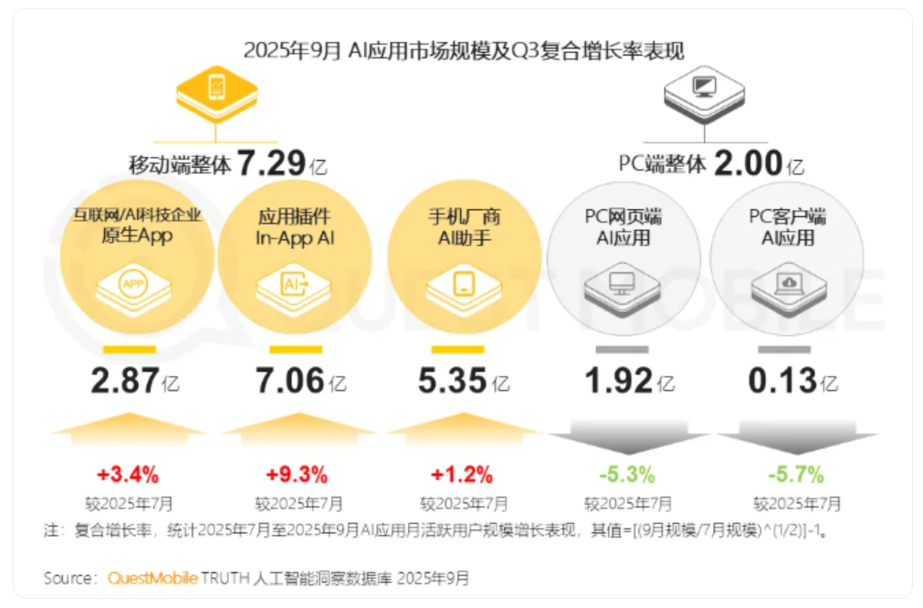 根据 QuestMobile 最新发布的2025年三季度 AI 应用行业报告显示,移动端 AI 应用的用户规模已突破7亿大关,其中移动端原生 APP、In-APP AI 和手机厂商的 AI 助手的月活跃用户分别达到了2.87亿、7.06亿和5.35亿,三季度的复合增长率分别为3.4%、9.3% 和1.2%。这一增长主要得益于各大厂商在模型升级和生态协同方面的努力。