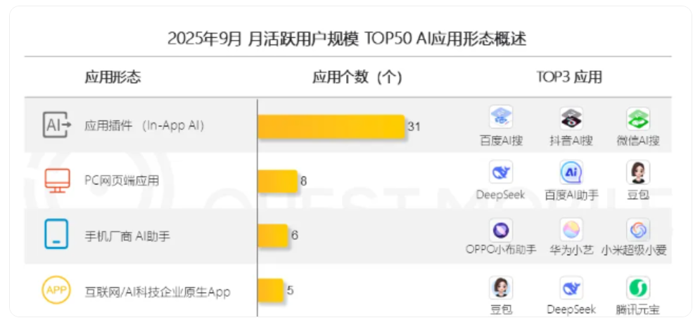 从用户使用情况来看,移动端的 AI 应用插件在月活跃用户中占据了31个位置,领先于其他形态,前三名分别是百度 AI 搜、抖音 AI 搜和微信 AI 搜。在全行业 TOP20应用中,拥有 In-App AI 的应用平均每个落地了2.5个 AI 应用,显示了插件形态的强劲表现。