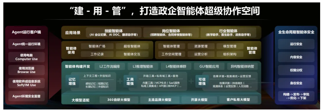 360发布了全球首款囊括L2级-L4级三代Agent的企业级智能体构建与运营平台,致力于帮助政企用户系统化地“建好、用好、管好”智能体,使其与业务场景深度融合,提供可复制的AI转型路径与行业范式,推动政企实现无门槛、全链路、高可信地拥抱智能体时代。