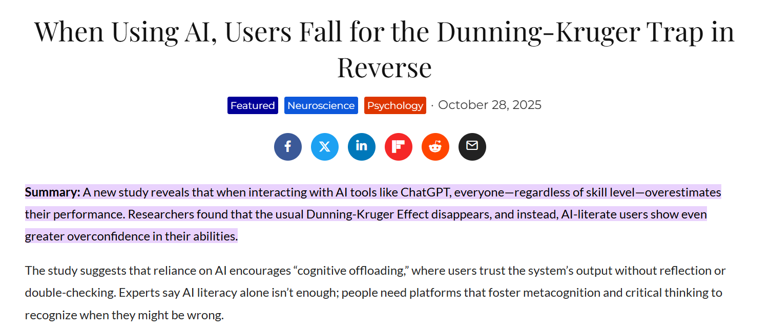 根据阿尔托大学的研究,使用人工智能(AI)工具可能使我们对自己的认知能力产生误判。普遍情况下,人们倾向于自我评估为 “略好于平均水平”,这种现象在认知测试表现较差的人群中尤为明显,被称为 “达克效应”(Dunning-Kruger Effect)。也就是说,能力较差的人往往高估自己的能力,而能力较强的人却更容易低估自己。