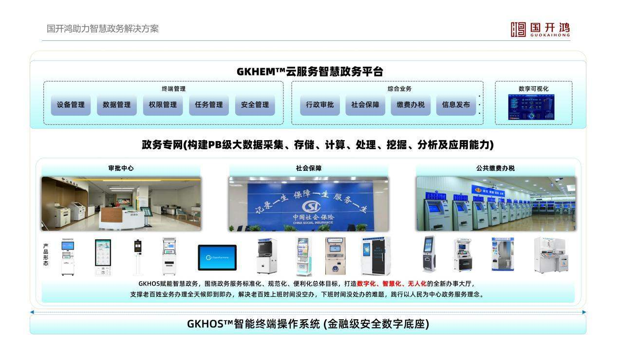 本次开源鸿蒙政务的解决方案,通过GKHOS智能终端操作系统(金融级安全数字底座),构建GKHEM云服务智慧政务平台,其核心主题是打破设备壁垒,重构服务流程,旨在解决传统政务服务中,手机App与线下自助终端相互割裂的“信息孤岛”问题,通过构建一个以用户个人手机为中心、与政务终端无缝协同的办事生态,让政务服务流程像在同一台设备上运行一样流畅自然,真正实现“数据多跑路,群众少跑腿”的理念,加快推进政务服务技术全面提升,加强政务服务应用与推广,围绕政务服务标准化、规范化、便利化建设总体目标,实现数字化、智慧化、无人化的全新办事大厅。