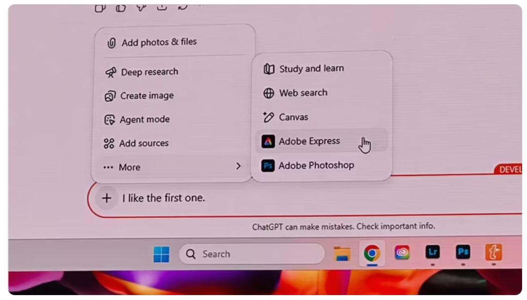 现在,用户在ChatGPT界面点击“更多”菜单,即可直接调用Adobe应用。在全新“扩展模式”下,你只需输入如“把这张照片背景换成夕阳海滩,人物调亮一点”或“生成一张科技感十足的AI大会传单”,系统便会自动调用Adobe Express生成初稿,并支持在ChatGPT内直接微调参数——比如调整色调、更换字体、缩放元素,全程无需重复输入指令。
