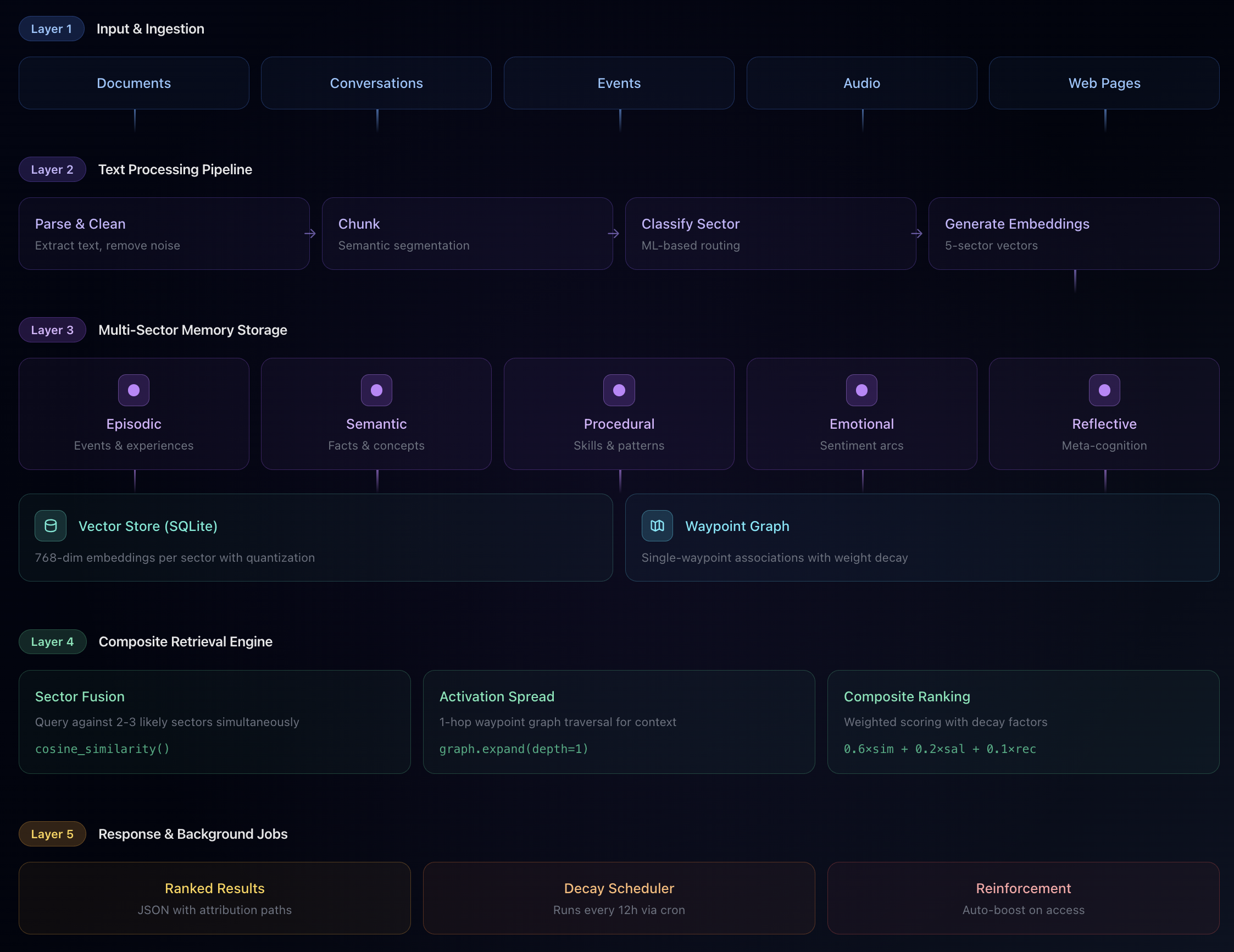 它采用独特的 分层记忆分解(HMD)架构,将记忆划分为情景、语义、程序、情感和反思等多个“认知扇区”,并通过稀疏的“路标图”实现高效、可解释的联想检索。相比传统向量数据库或 SaaS 记忆服务(如 Zep、Supermemory),OpenMemory 在响应速度上快 2–3 倍,成本低 6–10 倍,并支持本地嵌入模型(如 Ollama、BGE、E5),保障数据隐私与完全控制权。