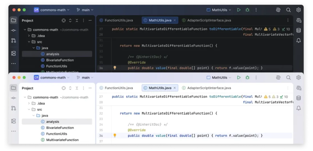 官方在 2025.2 EAP 阶段测试了两种设计方向,并结合反馈最终决定将当前的 Islands 主题作为后续迭代的方向。