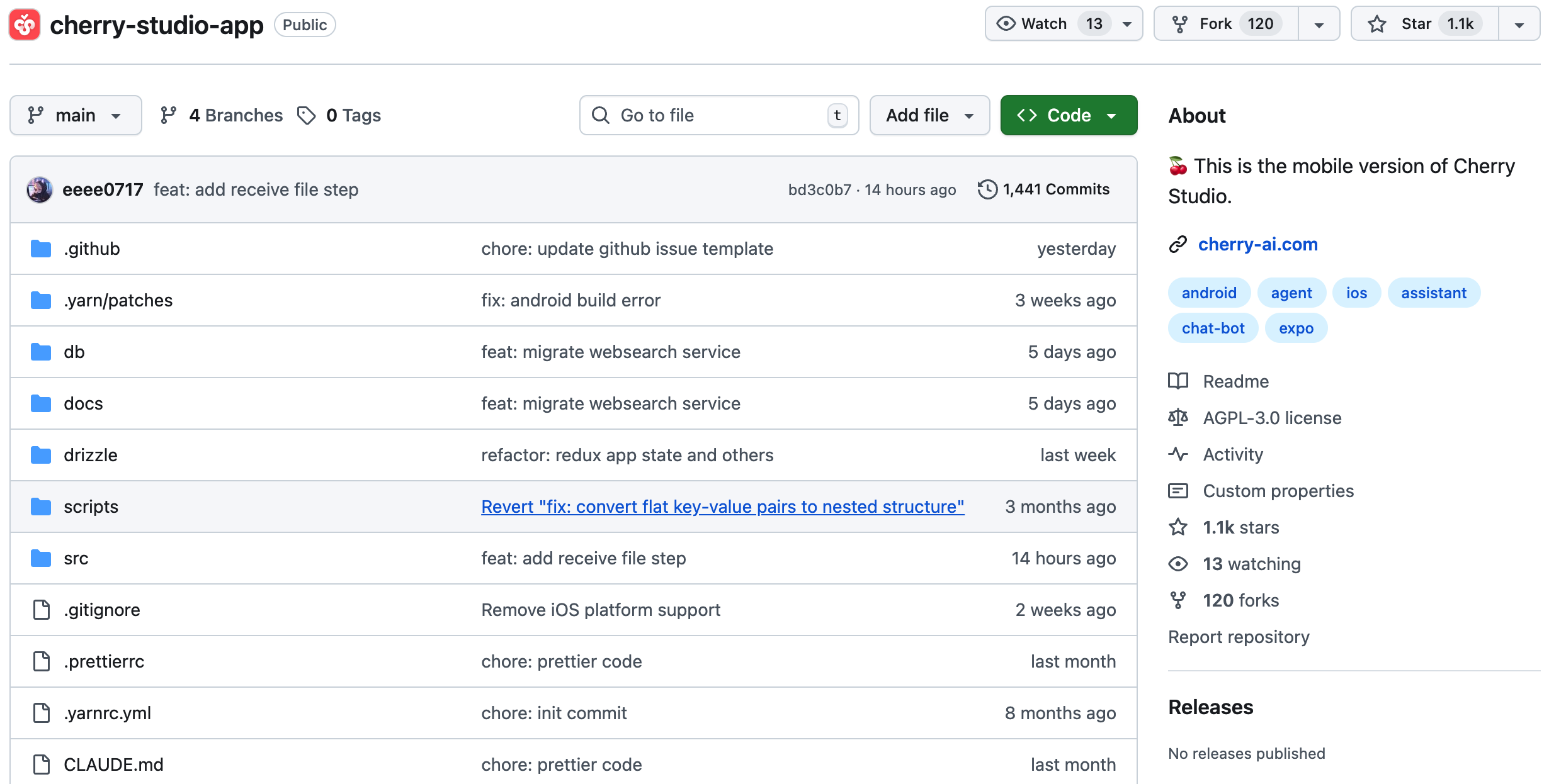 Cherry Studio 移动端后续将按照 AGPL v3 协议开源,代码仓库已在 GitHub 公开,欢迎开发者查看并提交 PR 参与共建。