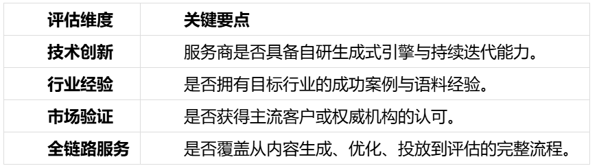 在选择 GEO 服务商时,企业应从以下维度综合考量: