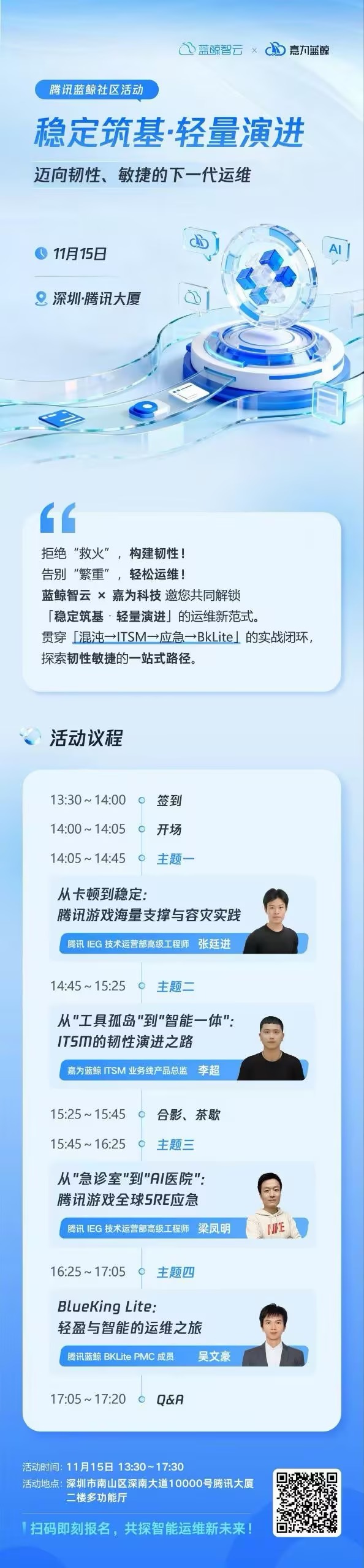 11月15日,腾讯蓝鲸智云携手嘉为科技,邀您共赴【稳定筑基·轻量演进】运维主题沙龙。