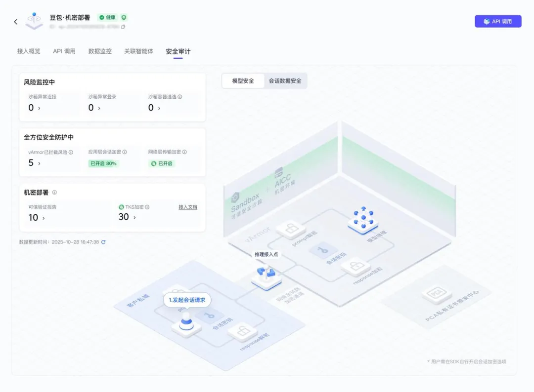该功能让用户在火山方舟可使用芯片级的机密推理服务,让企业隐私数据在云端获得与本地同等安全的计算保障,确保企业在火山方舟的数据"唯用户可见、唯用户所用、唯用户所有"。