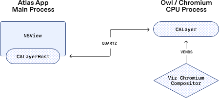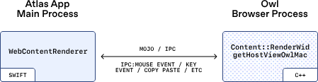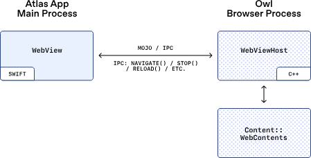 据介绍,OWL架构将Chromium作为独立进程运行,主应用基于SwiftUI等原生框架构建,两者通过Mojo(Chromium的IPC系统)通信。