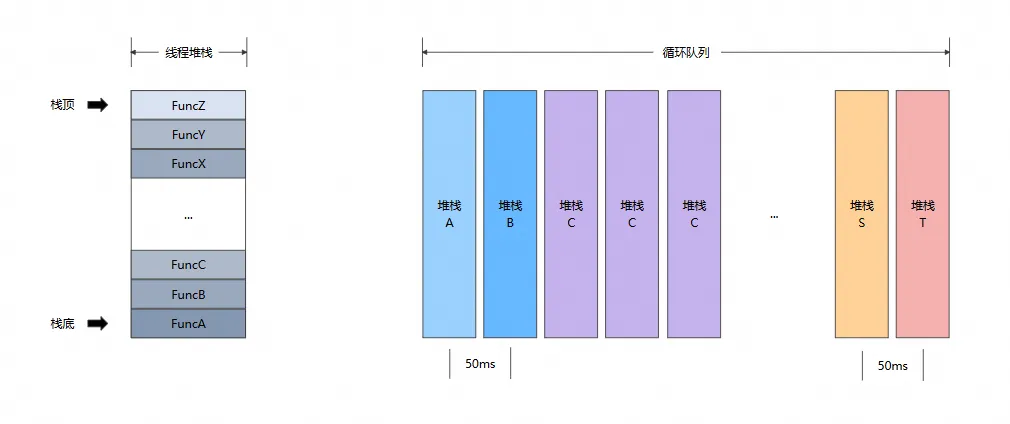 当监控线程监测主线程 RunLoop 时,会获取主线程的线程快照作为卡顿堆栈。但是,这个主线程堆栈不一定是最耗时的堆栈,也不一定是导致主线程超时的主要原因。为了对这个问题进行优化,需要在检测到主线程发生卡顿时,通过对保存在循环队列中的堆栈进行回溯(间隔 50ms 获取一次),获取最近最耗时堆栈。