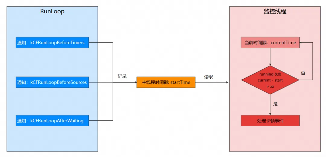 kCFRunloopBeforeWaiting和kCFRunLoopExit通知时,把running状态置为 NO。 - 监控线程需要持续读取