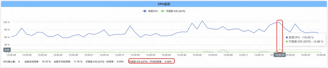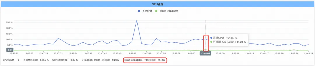 卡顿监控功能开启的情况下,App 持续运行一段时间并主动触发卡顿,App 整体的 CPU 占用如下图: