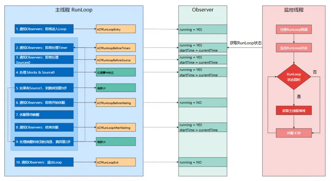 状态标记与超时判断:子线程根据 RunLoop 的状态变化来设置标记,并循环检测该标记是否在预设的阈值内被更新,否则判定为卡顿。