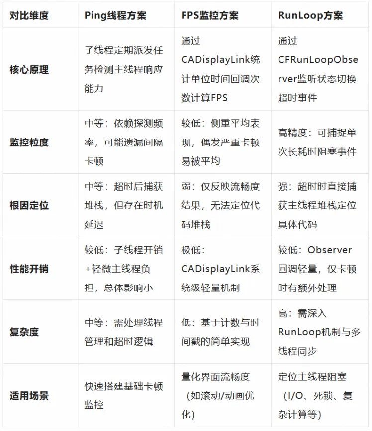 - Ping 线程方案通过子线程周期性探测主线程响应时间识别卡顿,但精度低于 RunLoop 方案。