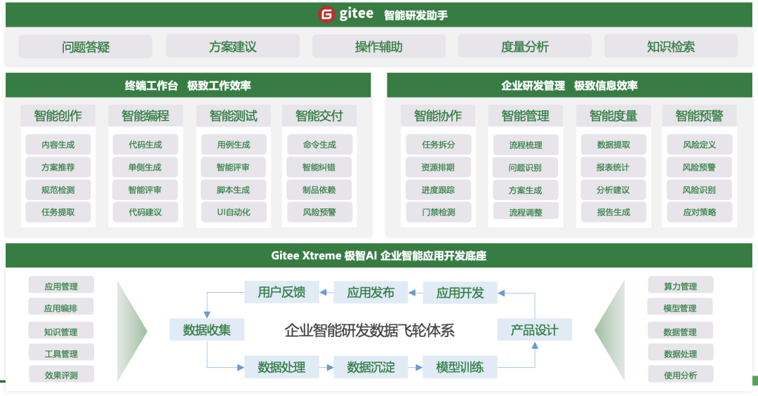 围绕这一目标,Gitee 提出了融合 DevOps 与智能体(Agent)的全新架构,以 Gitee DevOps 为地基,以智能体驱动为核心,构建出一整套覆盖研发全流程的智能化体系,既解放人力、又保障质量,让企业研发真正步入 AI 原生时代。