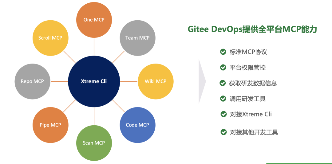 为了让智能体在企业研发流程中真正落地,Gitee 构建了覆盖工具、权限、数据的全平台 MCP: