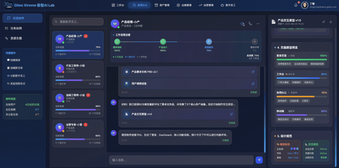 Gitee 的智能研发体系不仅提升了单点工具的智能化水平,更致力于打造多智能体协作体系:不同能力的智能体(代码生成、测试编排、文档解析、数据分析等)可并行运行,协同处理复杂研发任务。