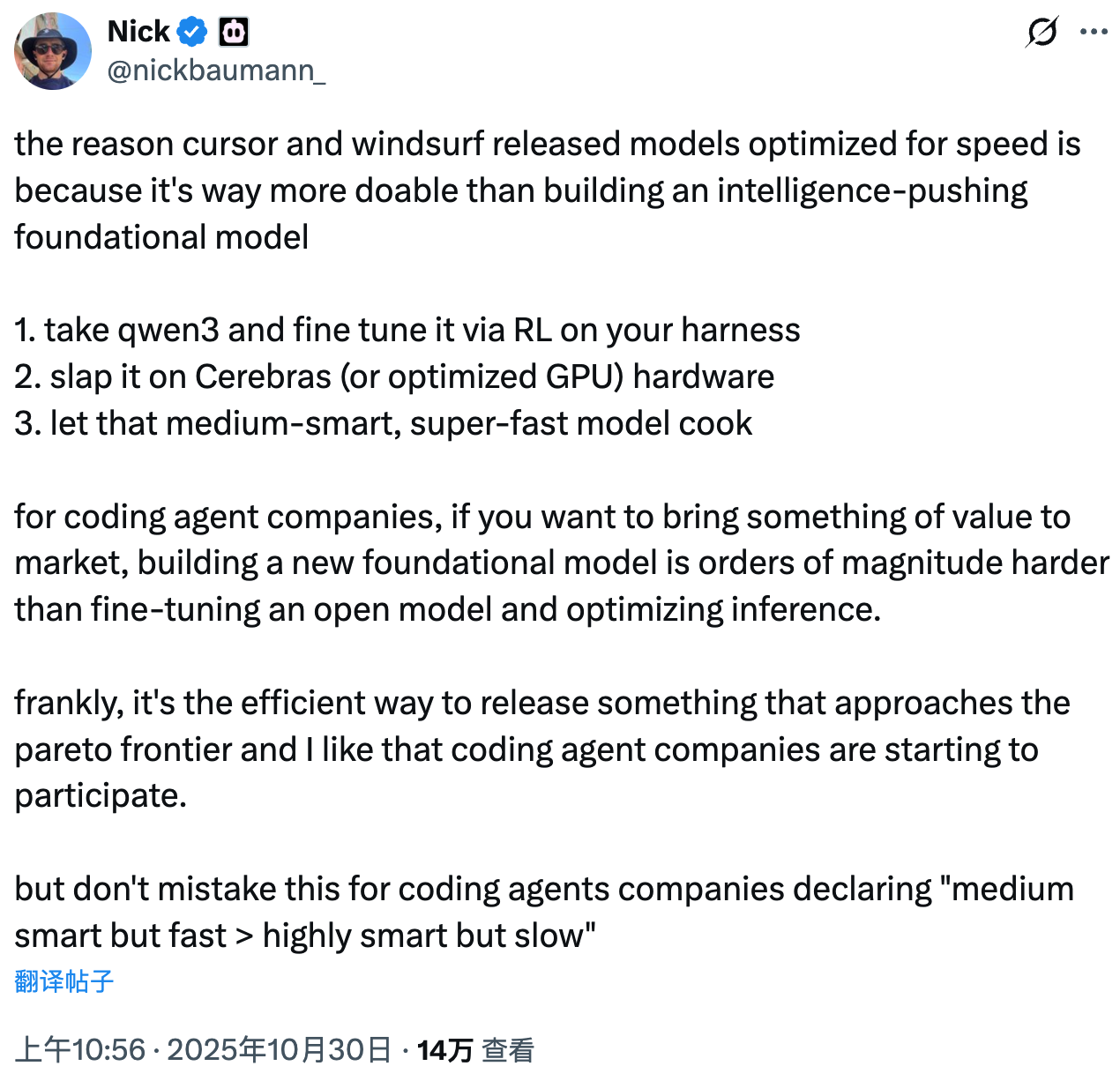 Cursor和Windsurf之所以发布针对速度优化的模型,是因为这比构建一个追求极致智能的基础模型(foundational model)要容易得多。