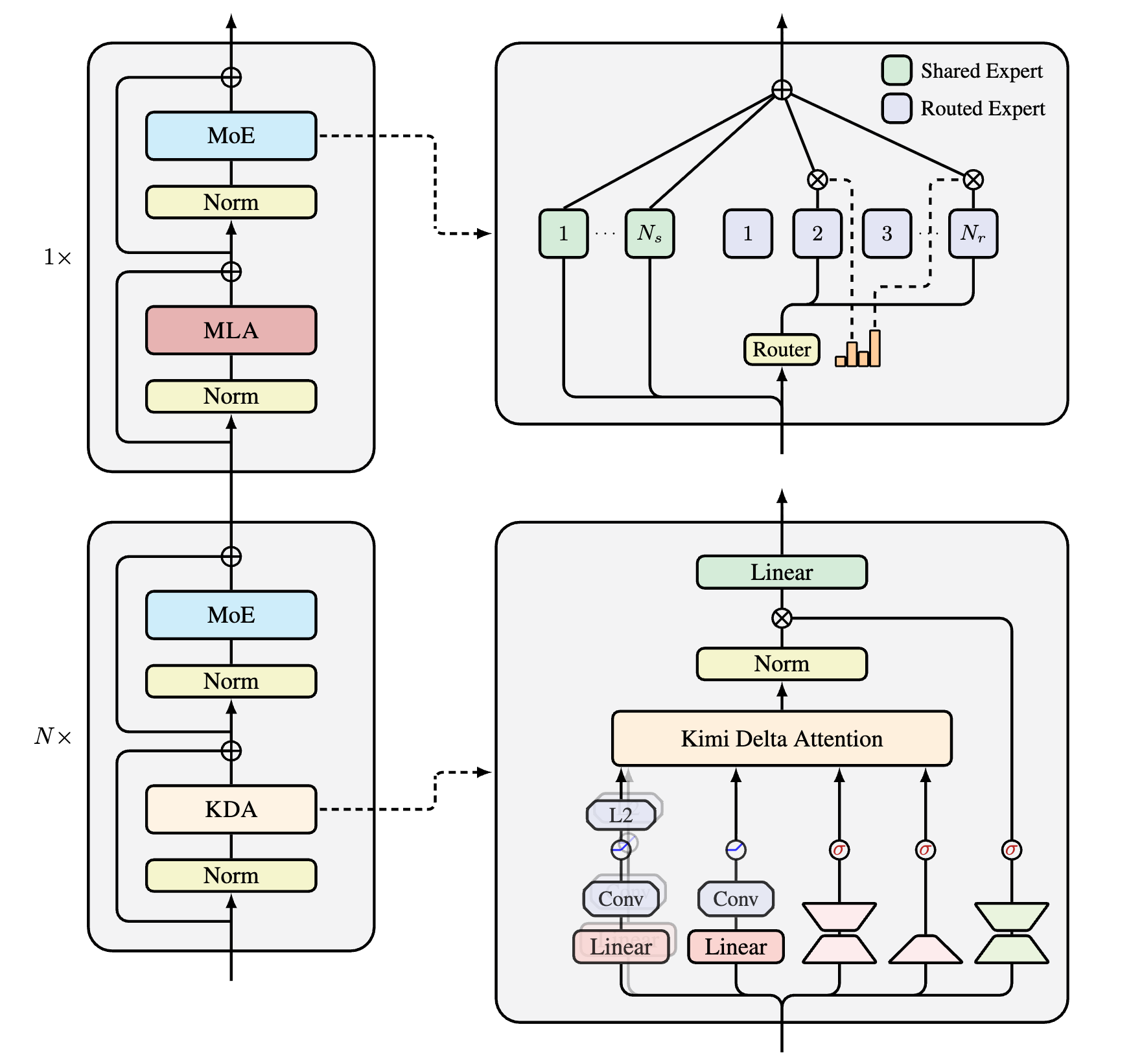 模型整体架构设计如图所示,延续了Moonlight的设计思路,别的回答已经有不少优秀的解读了。这次最大的不同在于我们将MoE的稀疏度设置得更激进,从8到32。 而 Kimi Linear 的核心设计原则,第一主要采用Linear Attention,这也是名字的由来,具体来说则是KDA,在GDN的基础上融入了 GLA 的细粒度门控。核心 Recurrent 公式中,关键的 Decay 部分已经标红了。