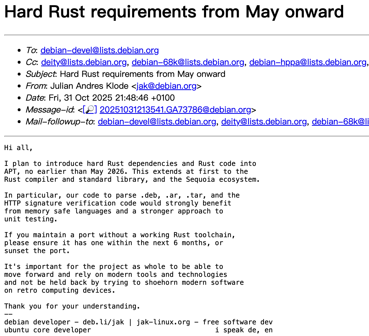 近日,Debian 开发者 Julian Andrés Klode 宣布,其包管理工具 APT 将从 2026 年 5 月起开始引入对 Rust 编译器及其标准库的硬性依赖。这意味着所有 Debian 支持的 CPU 架构都必须具备完整的 Rust 工具链,否则将面临被“淘汰”(sunset)的风险。