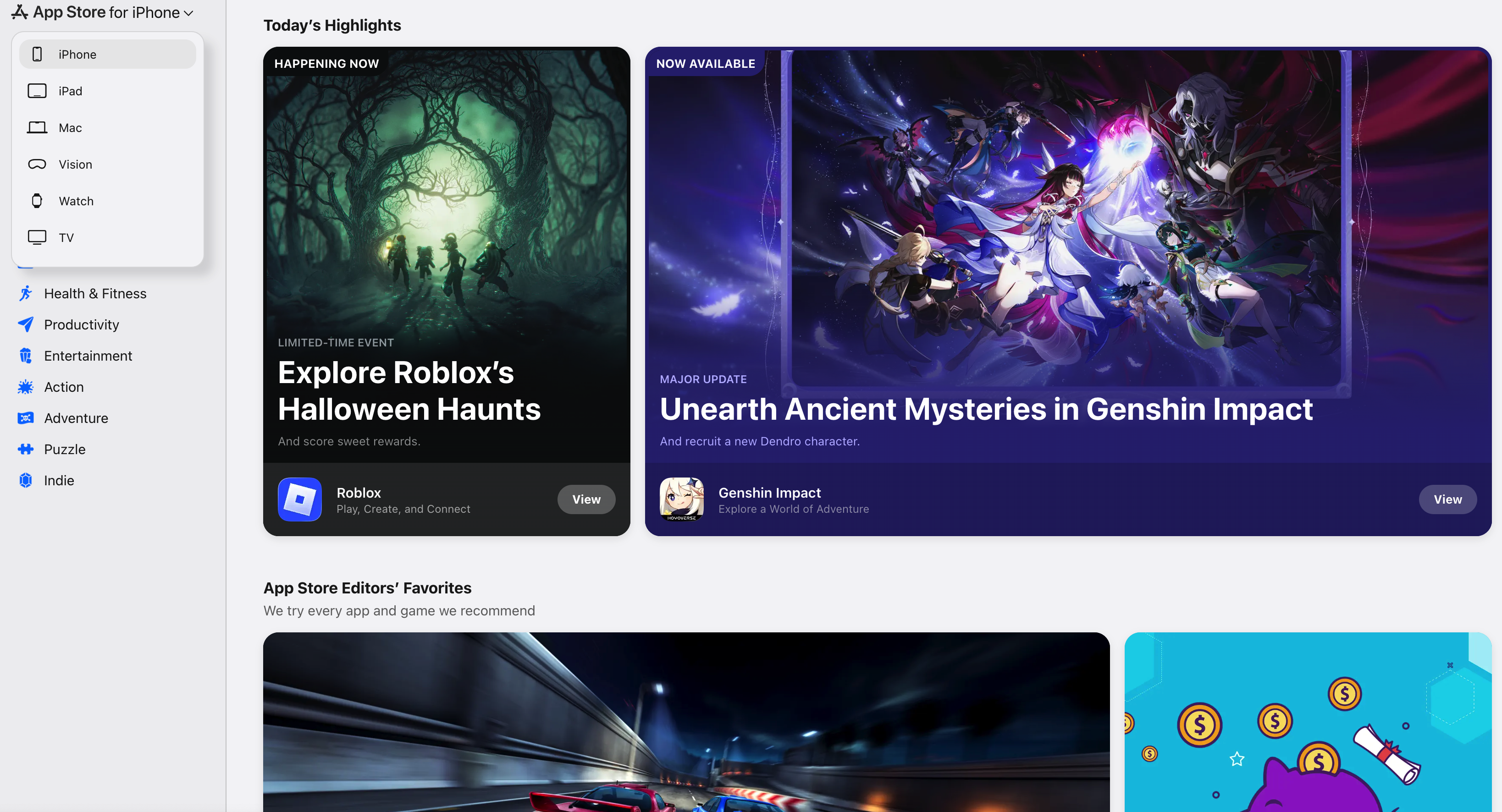此次网页版还内置了原生的浏览器搜索功能,支持用户直接查找和发现应用。此外,网站还支持无缝跨平台发现,用户通过顶部左边的下拉菜单,可以轻松切换浏览 iPhone、iPad、Mac、Apple Watch、Apple TV 甚至 Vision Pro 的应用。
