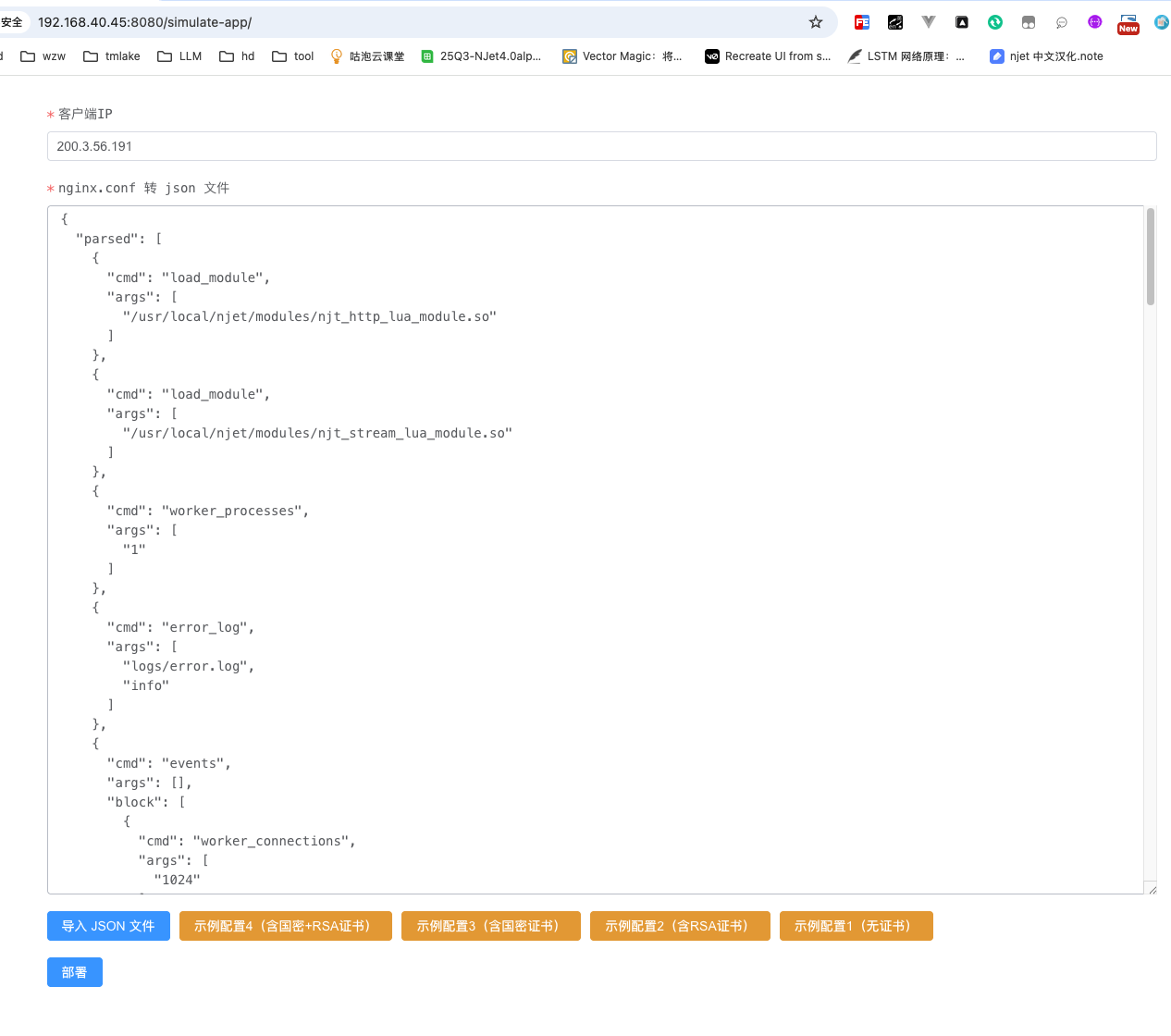 - 功能模拟依赖于导入配置文件,目前配置文件需要使用json格式,目前需要手工把nginx格式的配置文件转换为json,paste或上传,在下个版本中,将直接支持nginx.conf格式的配置