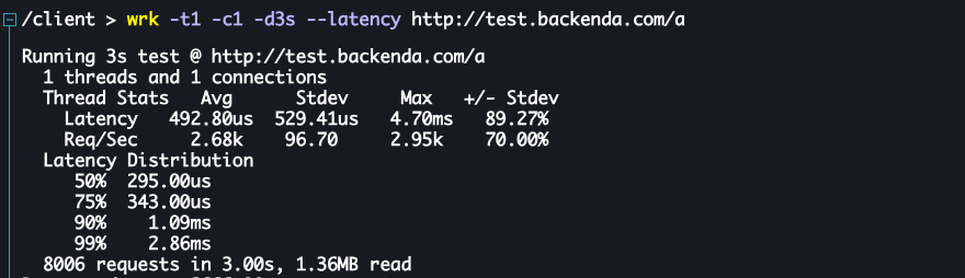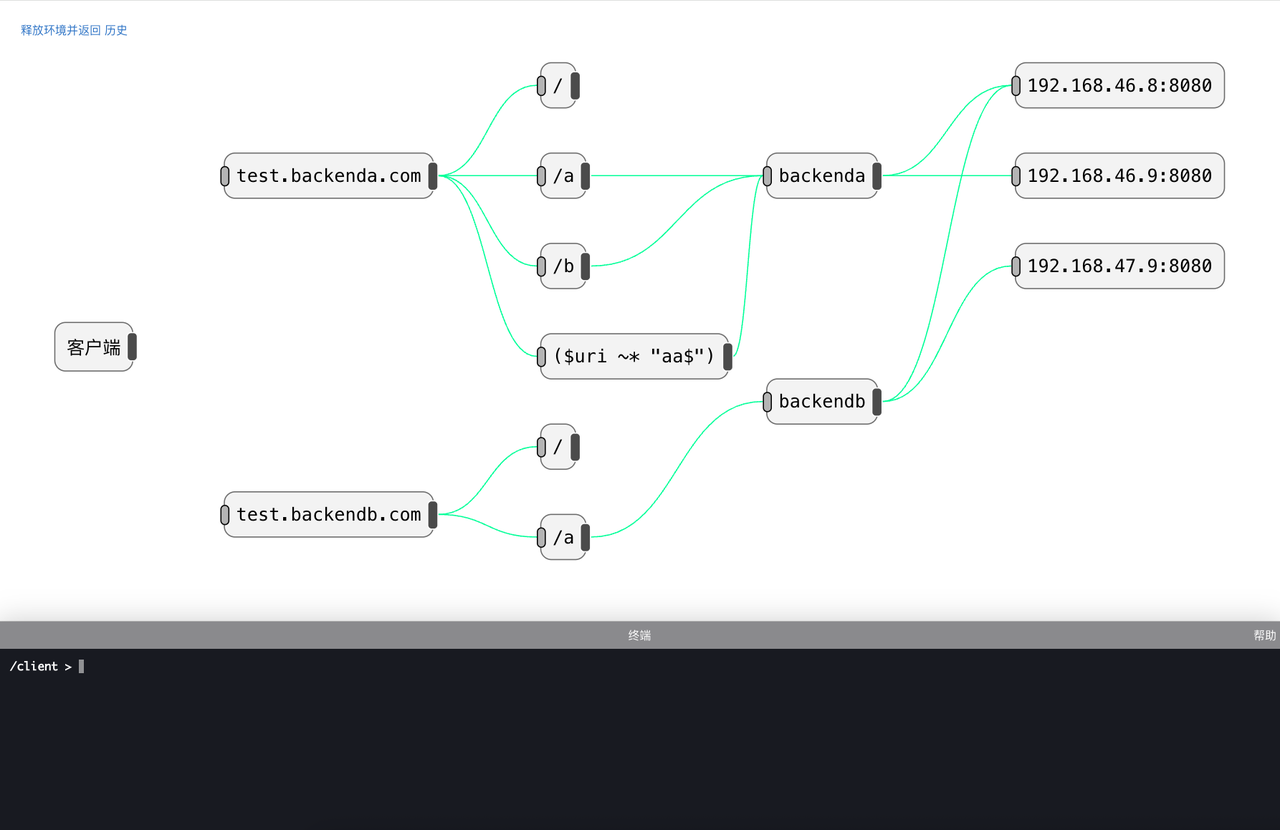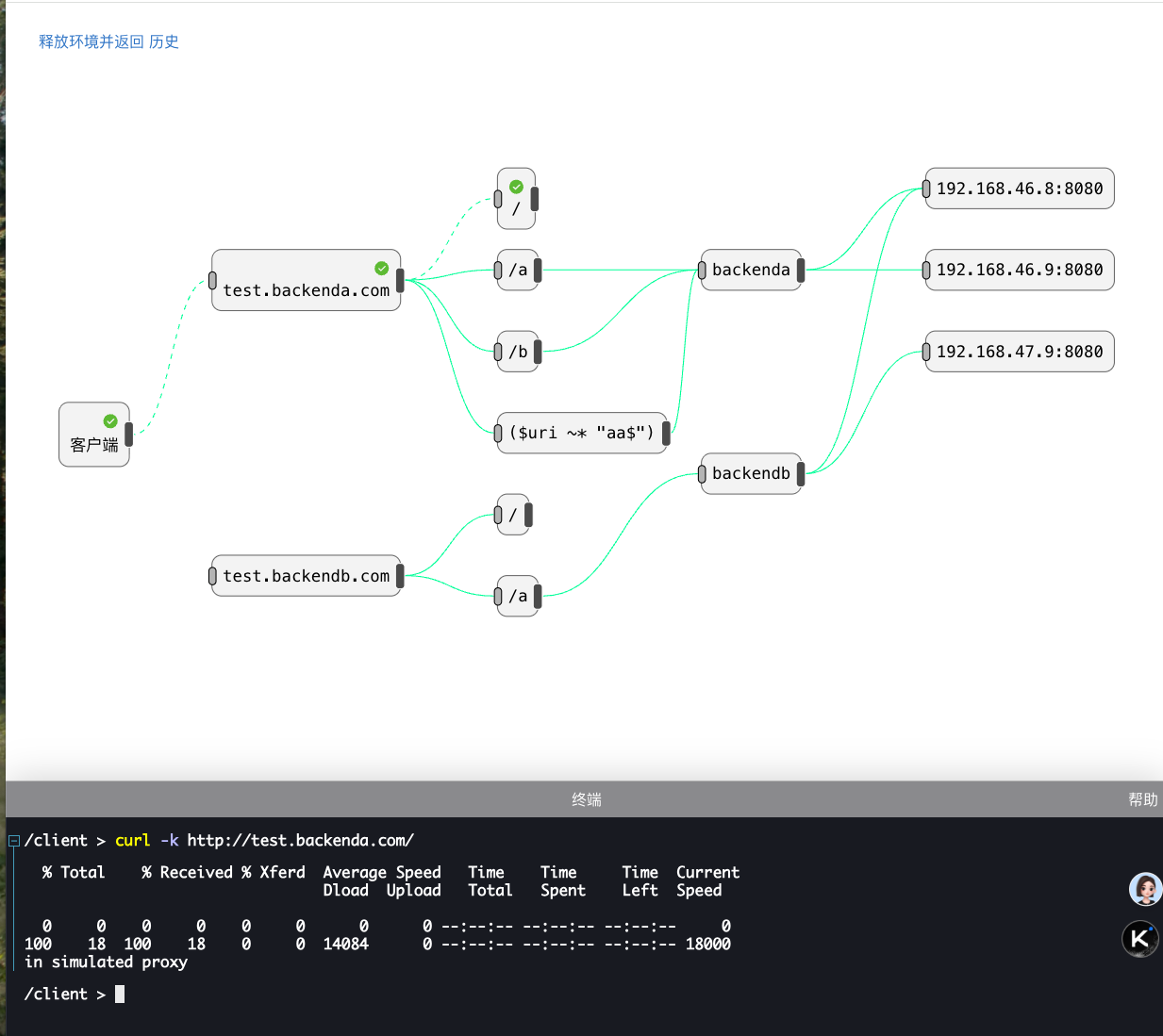 在模拟环境中,下侧为web terminal,可以输入特定的命令,单条或批量发送HTTP请求,验证配置的正确性。目前内置了curl和wrk命令,前者进行单条的功能测试,后者进行批量的测试